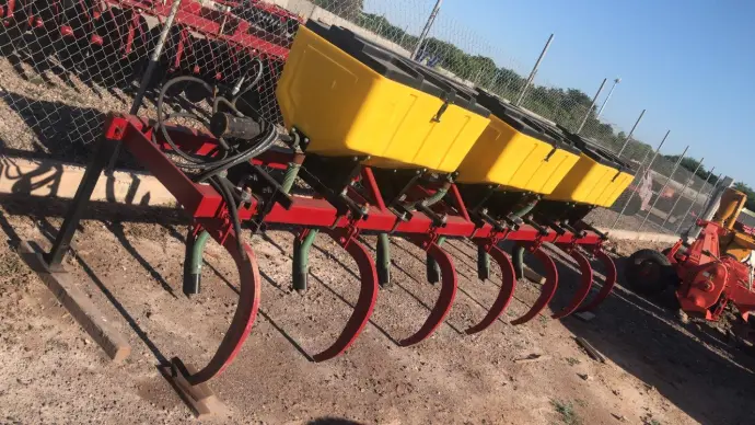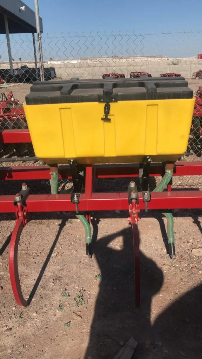 - Sistema de Botes Individuales: El equipo utiliza 3 o más tolvas amarillas (dependiendo de la configuración de llenado) que alimentan a los 6 timones. El material de polietileno es ideal porque es 100% resistente a la corrosión del fertilizante.